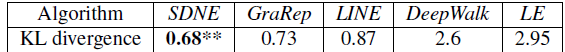 SDNE 方法的 KL 散度最低,定量地证明了我们的方法在可视化任务中的优越性。