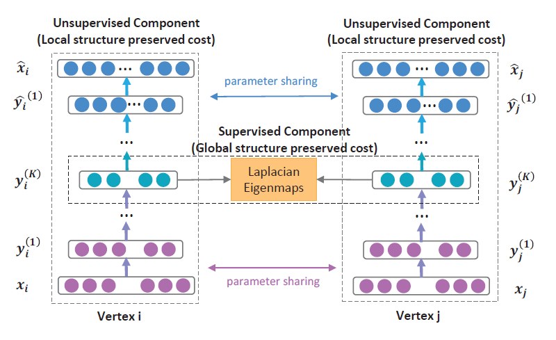 通过在所提出的半监督深度模型中联合优化无监督组件和监督组件,SDNE 可以很好地保持高度非线性的局部网络结构和全局网络结构,并且对稀疏网络具有鲁棒性。接下来我们将详细介绍如何实现半监督深度模型。