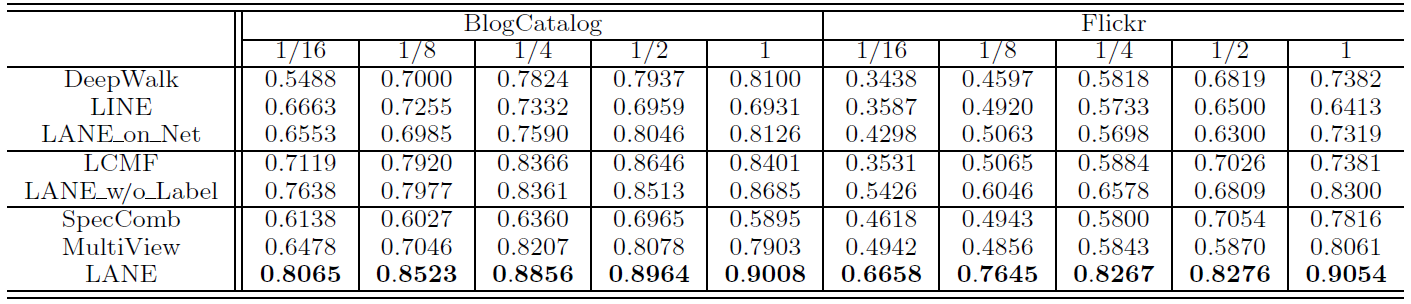 另外 LANE 也超过了属性网络embedding 方法 LCMF,这进一步证明了label 信息的优势。