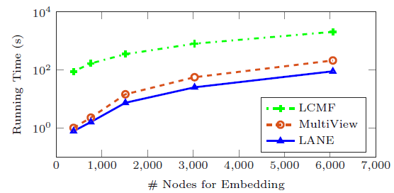 最后我们比较 LANE 和两种属性网络 ANE 方法(LCMF 和 MultiView )的运行时间。我们在 Flickr 数据集上观察输入节点数量和训练时间(对数表示)的关系,BlogCatalog 也有类似结果因此省略。