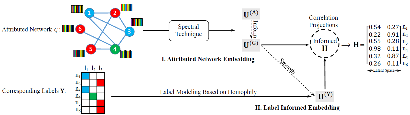 LANE 通过两个模块来学习节点的embedding :属性网络嵌入 ( Attributed Network Embedding)、标签信息嵌入 ( Label Informed Embedding) 。