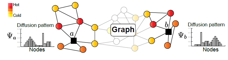 在论文 《Learning Structural Node Embeddings via Diffusion Wavelets》 中,作者通过开发 GraphWave 来解决图上的结构学习(structure learning) 问题。基于图信号处理(graph signal processing )技术,论文的方法基于以节点为中心的谱图小波的扩散( diffusion of a spectral graph wavelet ),从而为每个节点学习多维连续的结构 embedding 。直观而言,每个节点在图上传播一个能量单位( a unit of energy),并根据网络对该探针(probe )的响应来刻画其邻域拓扑( neighboring topology )。论文正式证明了这个小波(wavelet )的系数与图拓扑性质直接相关。因此,这些系数包含恢复结构相似节点的所有必要信息,而无需对特征进行显式地人工标记( hand-labeling )。