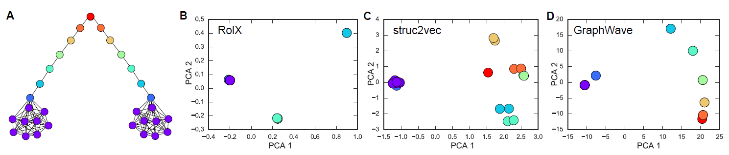 我们首先考虑一个杠铃图。杠铃图由两个长链组成的稠密团构成,该图包含 8 个不同类别的结构等价节点,如图A 的颜色所示。我们通过PCA 可视化了不同模型学到的embedding ,相同的 embedding 具有相同的投影,这使得图 B~D 上的点发生重叠。