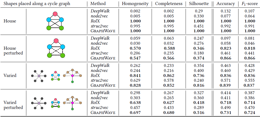 我们对这四种网络结构 house, varied, house perturbed, varied perturbed 分别构造一个图,然后在这些构造的图上运行不同方法来得到节点 embedding 。