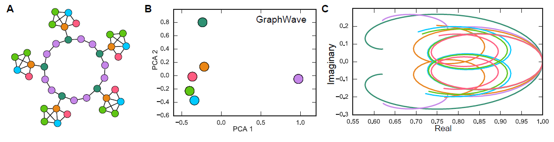 从图D 可以看出, GraphWave 可以正确学习结构等价顶点的embedding,这为我们的理论提供了支撑(相同颜色的顶点几何完全重叠)。