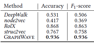 GraphWave 方法在两个分类指标上均优于所有其它方法,这表明了 GraphWave 具有学习结构特征的能力,这种结构特征对于不同的图都有重要意义,且具有很高的预测能力。
