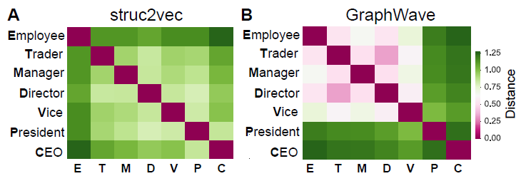 安然 email 网络:我们考虑对安然公司员工之间的电子邮件通信网络进行学习,由于公司存在组织架构,因此我们预期结构GraphWave 能够学到这种工作职位上的结构等价性。