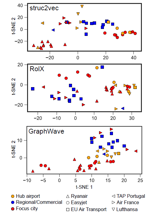 struc2vec 学习的 embedding 捕获了不同的航空公司,可以看到各航空公司的节点几乎各自聚在一起。这表明struc2vec 无法在不同的航空公司网络之间泛化,因此无法识别那些结构等价、但是不属于同一个航空公司的机场。