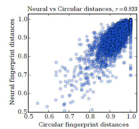 图中每个点代表:相同的一对分子,采用圆形指纹计算到的分子距离、采用神经图指纹计算得到的分子距离,其中神经图指纹模型采用大的随机权重。距离为1.0 代表两个分子的指纹(圆形指纹或神经图指纹)没有任何重叠,距离为0.0 代表两个分子的指纹圆形指纹或神经图指纹)完全重叠。
