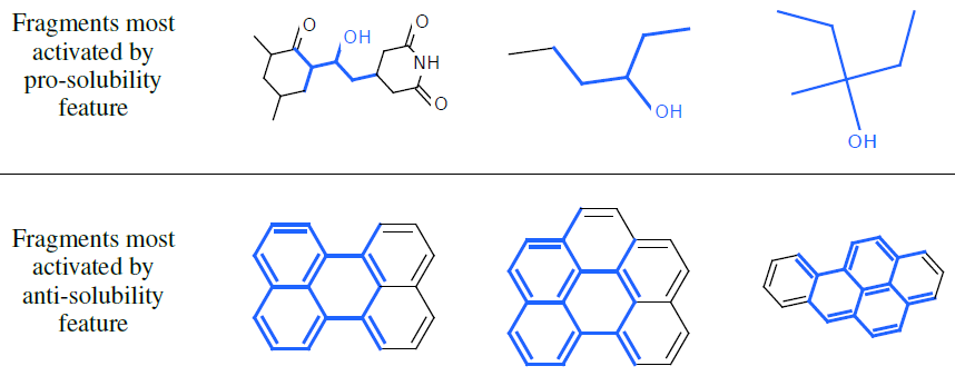溶解性特征:我们将神经图指纹模型作为预测溶解度的线性模型的输入来一起训练。下图展示了对应的fragment(蓝色),这些fragment可以最大程度的激活神经图指纹向量中最有预测能力的特征。