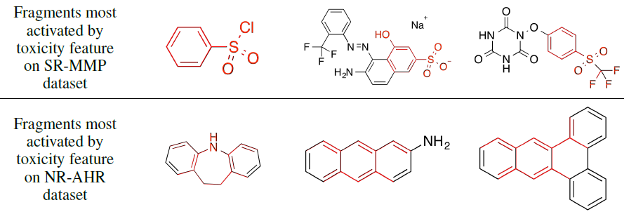 下半图:激活的指纹向量的特征与毒性具有正向的预测关系,这些特征大多数被稠合的芳环(也被称作多环芳烃,一种著名的致癌物)所激活。