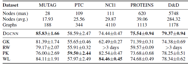 DGCNN 相比 graph kernel 具有很强的竞争力。