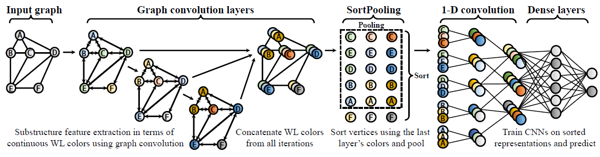 DGCNN 整体架构如下图所示:图数据首先通过多个图卷积层,其中节点信息在邻域之间传播;然后对节点特征排序并通过 SortPooling 层池化;然后传递给传统的 CNN 结构以学习模型。节点特征以颜色来可视化。