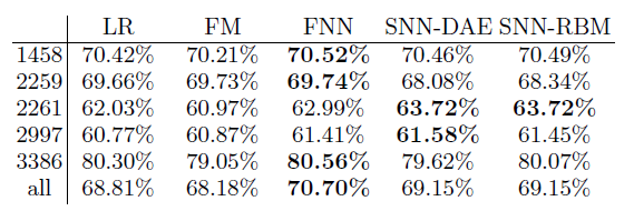 在所有测试集上,FNN 和 SNN 的性能超越了 LR 和 FM。