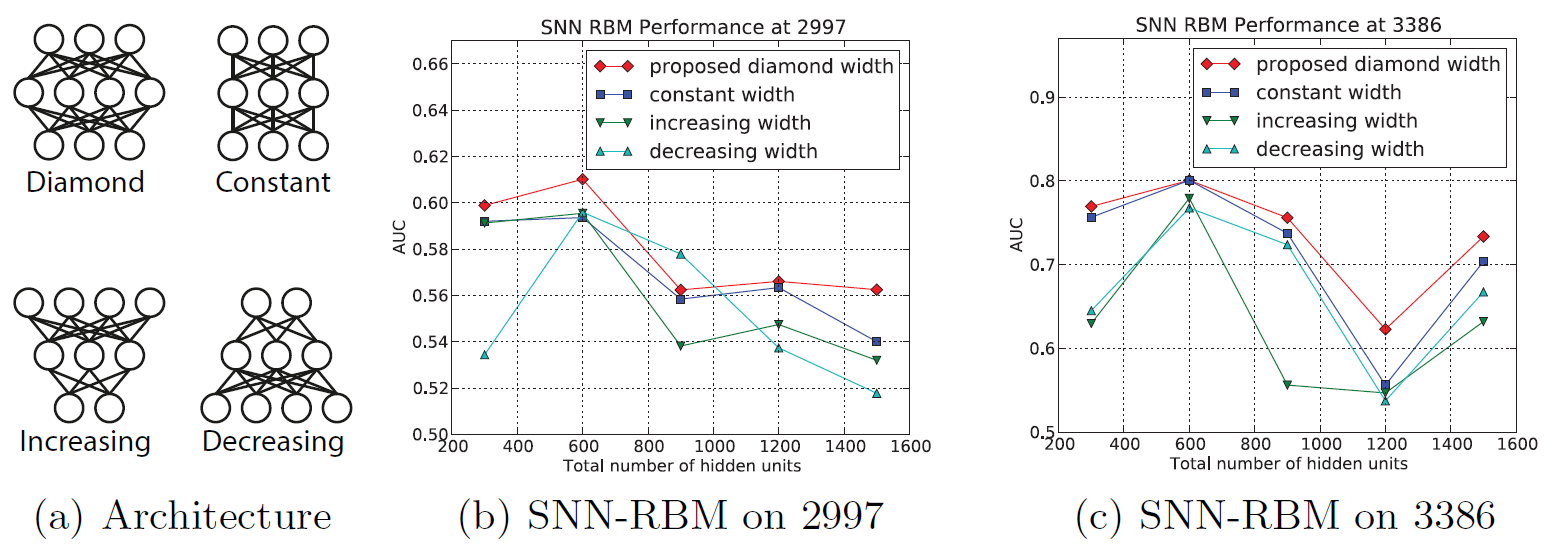 另一方面,菱形架构的最佳隐单元总数为 600,即 (200,300,100) 的组合。这取决于训练样本的数量。针对小规模数据集,如果有太多隐单元可能会导致过拟合。