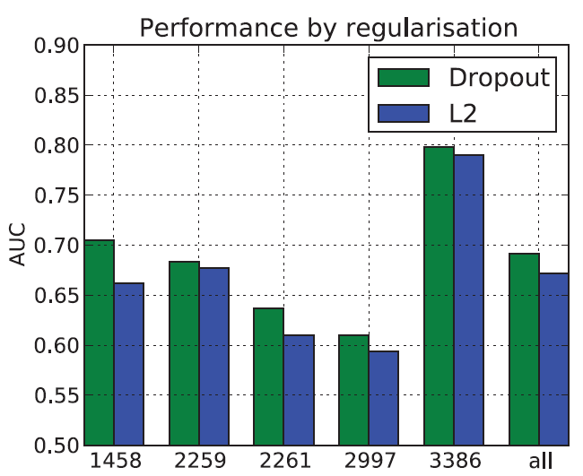 正则化:我们比较了 L2 正则化和 dropout 。下图显示了 SNN-RBM 模型采用不同正则化的性能比较。可以看到:在所有情况下 dropout 都优于 L2 。
