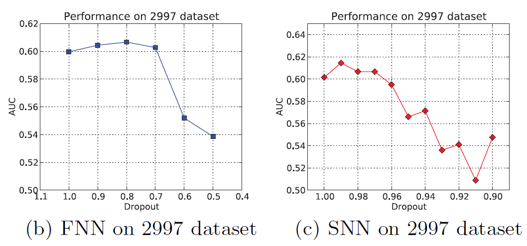 dropout rate:下图显示了 FNN 和 SNN 中, AUC 性能如何随着的 dropout rate 的增加而变化。这里的 dropout rate 指的是每个神经单元处于激活状态的概率(而不是丢弃的概率)。可以看到: