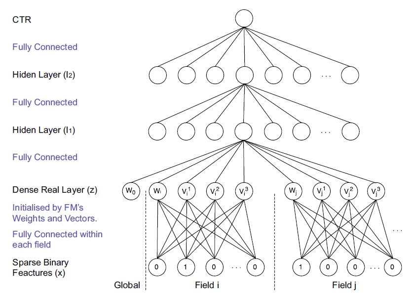 FNN 使用分解机来初始化监督学习的 embedding layer,从而将高维稀疏特征有效地降维到低维稠密连续特征。