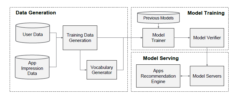 对于每个请求,server 从 app 检索系统接收一组 app 候选,以及接收用户特征,从而对每个 app 进行打分。然后,app 根据最高分到最低分进行排序,我们按照这个顺序向用户展示 app。分数是通过在 Wide & Deep 模型上运行前向推断来计算的。