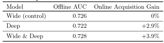 Wide & Deep 模型相对于对照组将 app acquisition rate 提升了 +3.9%(统计显著)。
