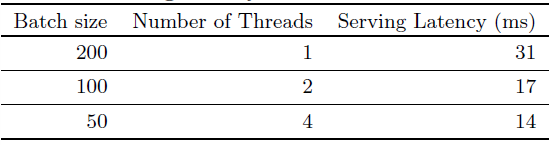 我们实现了多线程并行,并将每个 batch 拆分为更小的尺寸,这将客户端延迟显著降低到 14ms(包括 serving 开销),如下表所示。