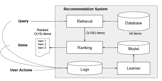 推荐系统可以被视为搜索排序系统(search ranking system),其中输入 query 是用户和上下文信息的集合,输出是 item 的 ranked list。给定一个 query,推荐任务是在数据库中找到相关(relevant)的 item ,然后根据某些指标(如点击或购买)对 item 进行排序。
