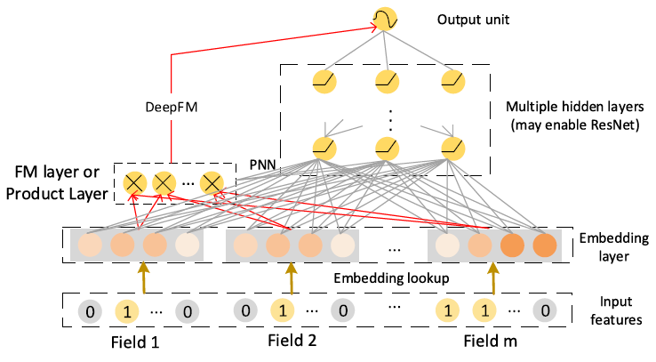 这个前向传播过程的视觉结构(visual structure)和下图中所示的网络结构(PNN 和 DeepFM )非常相似,只是这个前向传播过程不包含 FM Layer 或者 Product Layer。这个前向传播过程以 bit-wise 方式对交互进行建模。也就是说,即使是同一个 field embedding 内的元素也会相互影响。