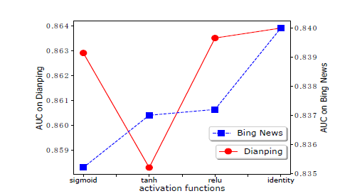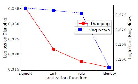 激活函数:注意,我们在CIN 神经元上用恒等映射作为激活函数。深度学习文献中一种常见做法是在隐层神经元上使用非线性激活函数。因此,我们在 CIN 上比较不同激活函数的结果(对于 DNN 中的神经元,我们保持使用 relu 激活函数)。如下图所示,恒等映射确实是最适合 CIN 中神经元的激活函数。