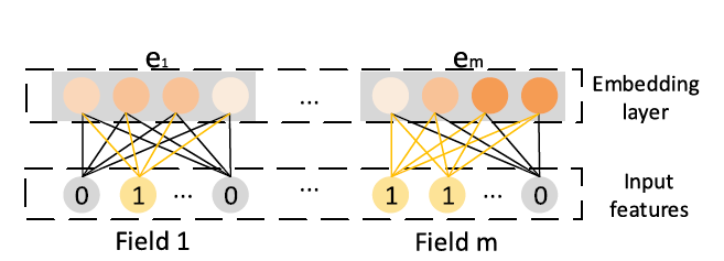 embedding 层(Embedding Layer):在计算机视觉或自然语言理解中,输入数据通常是图像信号或文本信号,这些信号在空间或/和时间上是相关的,因此 DNN 可以直接应用于具有稠密结构(dense structure)的原始特征。然而,在 web-scale 的推荐系统中,输入特征稀疏、维度巨大,并且没有明显的空间相关性或时间相关性。 因此,multi-field 的 categorical 形式被广泛采用。例如,一个样本的输入 [user_id=s02,gender=male, organization=msra,interests=comedy&rock] 通常通过 field-aware 的 one-hot 编码转换为高维稀疏特征: