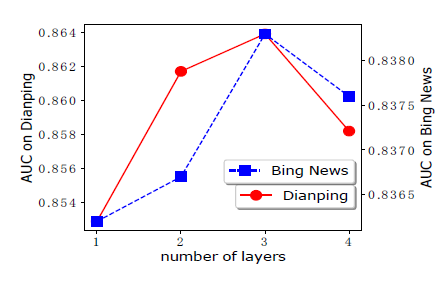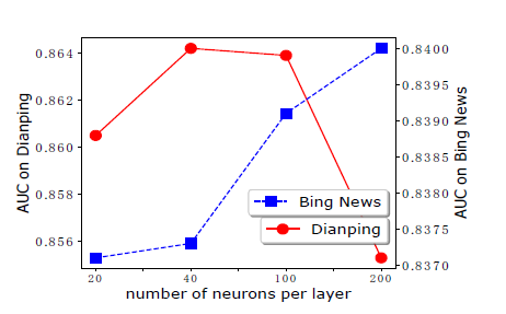 每层神经元数量:增加每层神经元数量表示增加 CIN 中的 feature map 数量。如下图所示,当我们将每层神经元数量从 20 增加到 200 时,Bing News 数据集上的模型性能稳步提高。而在 Dianping 数据集上,100 是最佳的每层神经元数量。在这个实验中,我们将隐层深度固定为 3 。