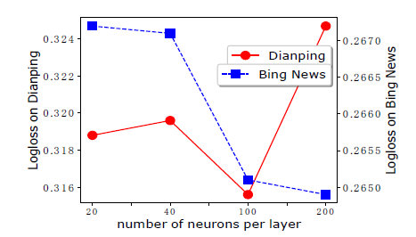 每层神经元数量的默认设置为:DNN 部分每层 400 个神经元;CIN 部分在 Criteo 数据集上每层 200 个神经元、在Dianping 数据集和 Bing News 数据集上每层 100 个神经元。