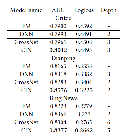 下表显式了所有单体模型在三个实际数据集上的表现,Depth 列表示超参数调优找到的最佳网络深度。这里 CIN 是 xDeepFM 的 CIN 网络,不包含 xDeepFM 的 DNN 部分。CrossNet 是 DCN 的 cross network 部分,也不包含 DNN 部分。