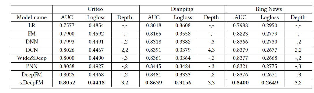 表中的 Depth 列给出整体模型通过超参数调优得到的各个组件的最佳深度,格式为 ” cross 层深度,DNN 层深度“。