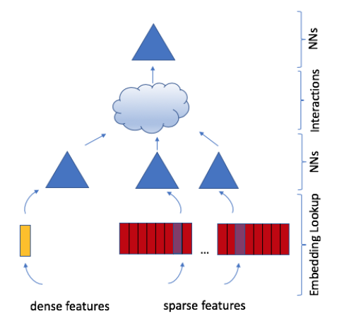 在论文 《Deep Learning Recommendation Model for Personalization and Recommendation Systems》 中,论文介绍了一个由上述两种观点结合而成的个性化模型。该模型使用 embedding 来处理代表离散数据的稀疏特征(sparse features)、使用多层感知机(multilayer perceptron: MLP)来处理稠密特征(dense features),然后使用 《Factorization machines》 中提出的统计技术显式的交互(interacts)这些特征。最后,模型通过另一个 MLP 对交互作用进行后处理(post-processing)从而找到事件的概率。