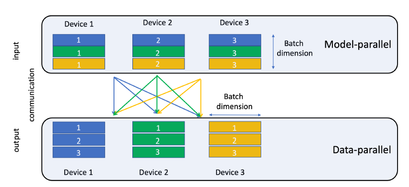 我们注意到,对于数据并行 MLP,反向传播中的参数更新以 allreduce 进行积累(accumulated),并以同步(synchronous)的方式应用于每个设备上的拷贝参数(replicated parameters),从而确保每个设备上的更新参数(updated parameters)在每次迭代之前都是一致(consistent)的。