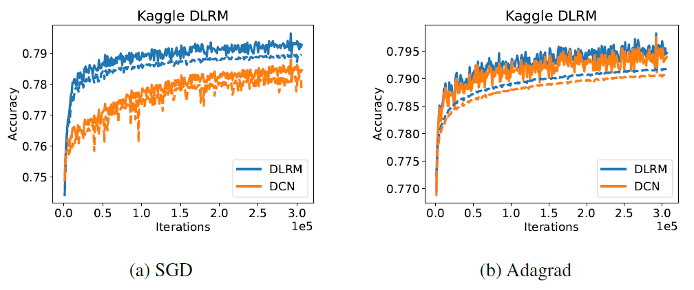 我们在 Criteo Ad Kaggle 数据集上评估了模型的准确率,并将 DLRM 和 Deep and Cross network: DCN 的性能进行了比较,后者没有进行额外的调优。我们和 DCN 进行比较,因为它是在相同数据集上具有综合结果(comprehensive results)的少数模型之一。