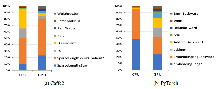 为了分析我们模型在单设备上的性能,我们考虑了一个具有8 个离散特征、512 个连续特征的模型。每个离散特征都通过一个包含 1M 个向量的 embedding table (即类目总数有1M )进行处理,向量维度为 64。而连续特征被组装(assembled)为一个 512 维的向量。bottom MLP 有两层,而 top MLP 有四层。我们让具有 2048K 个随机生成样本的数据集上分析了该模型,其中 mini-batch 的 batch size = 1K 。