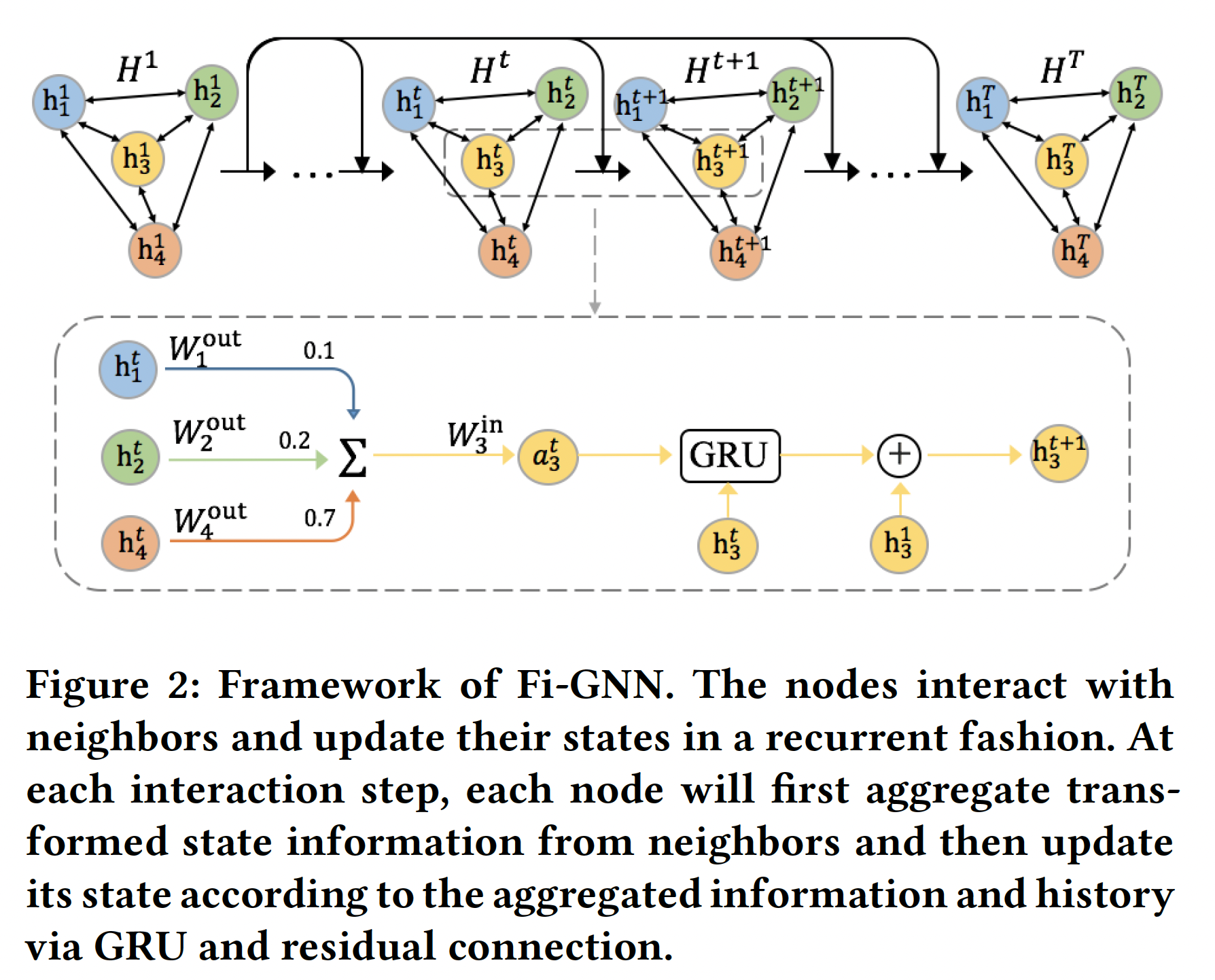 如下图所示,节点以循环方式进行交互并更新其状态。在每一个 interaction step 中,节点聚合邻居节点的状态信息(经过变换之后),然后根据聚合信息、以及节点历史状态通过 GRU 和残差连接来更新节点状态。