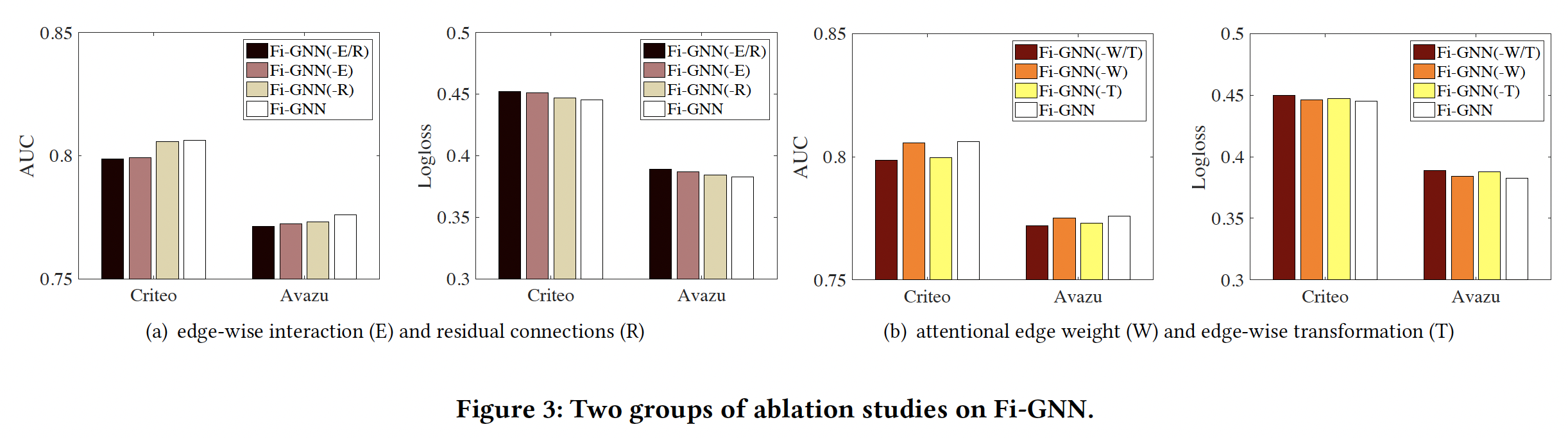 在 Fi-GNN 中,我们采用两种方法来实现 edge-wise node interaction :attentional edge weight: W、edge-wise transformation: T 。为了进一步研究巨大的改进来自哪,我们比较了另外三个变体: