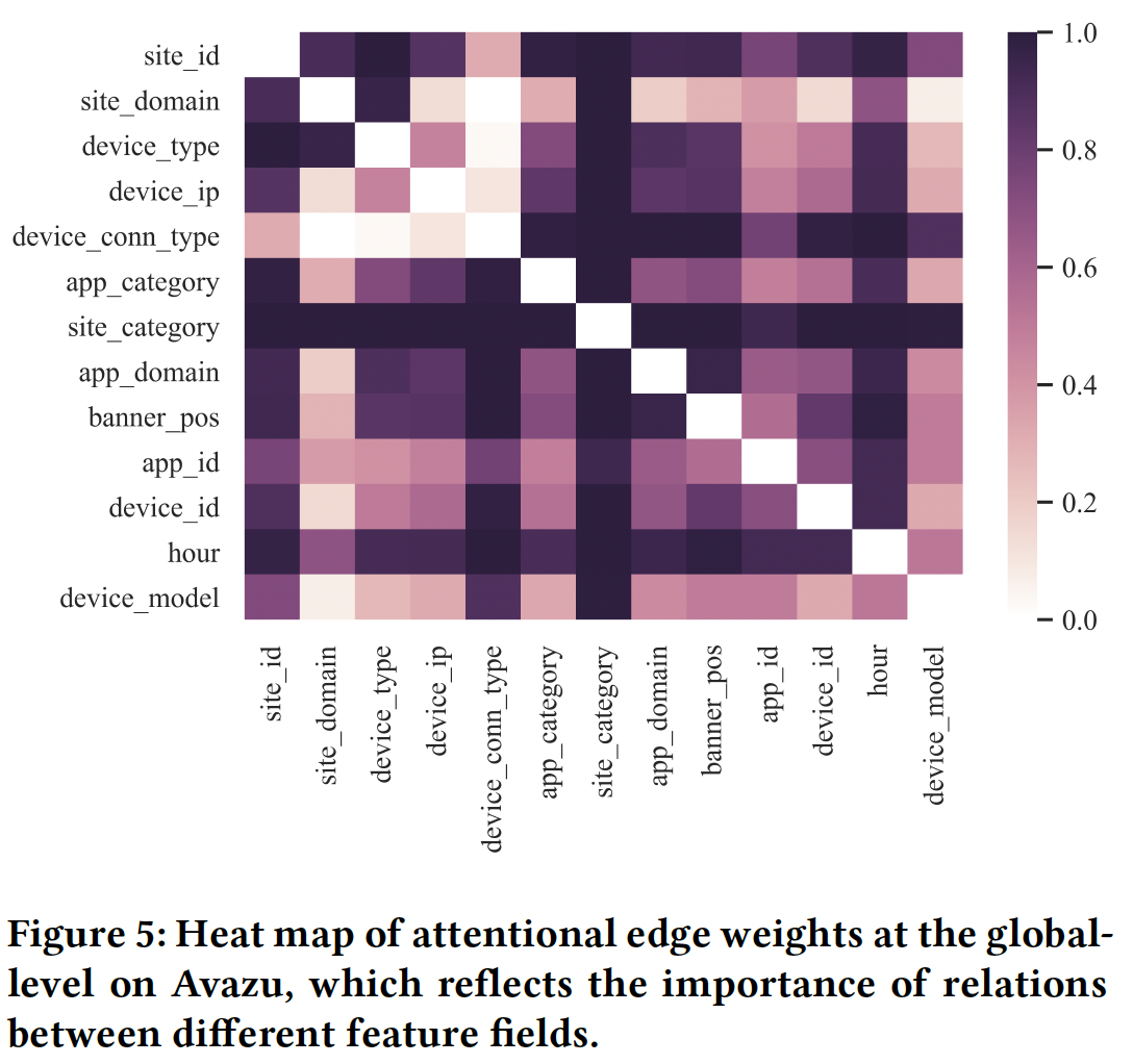 attentional edge weight :attentional edge weight 反映了两个相连的 field node 之间交互的重要性,也反映了两个feature field 之间的关系。下图展示了 Avazu 数据集中所有样本的全局平均邻接矩阵的热力图,它可以在全局水平上反映不同 field 之间的关系。 由于有一些 field 是匿名的,我们只显示剩余的 13 个具有真实含义的 feature field 。
