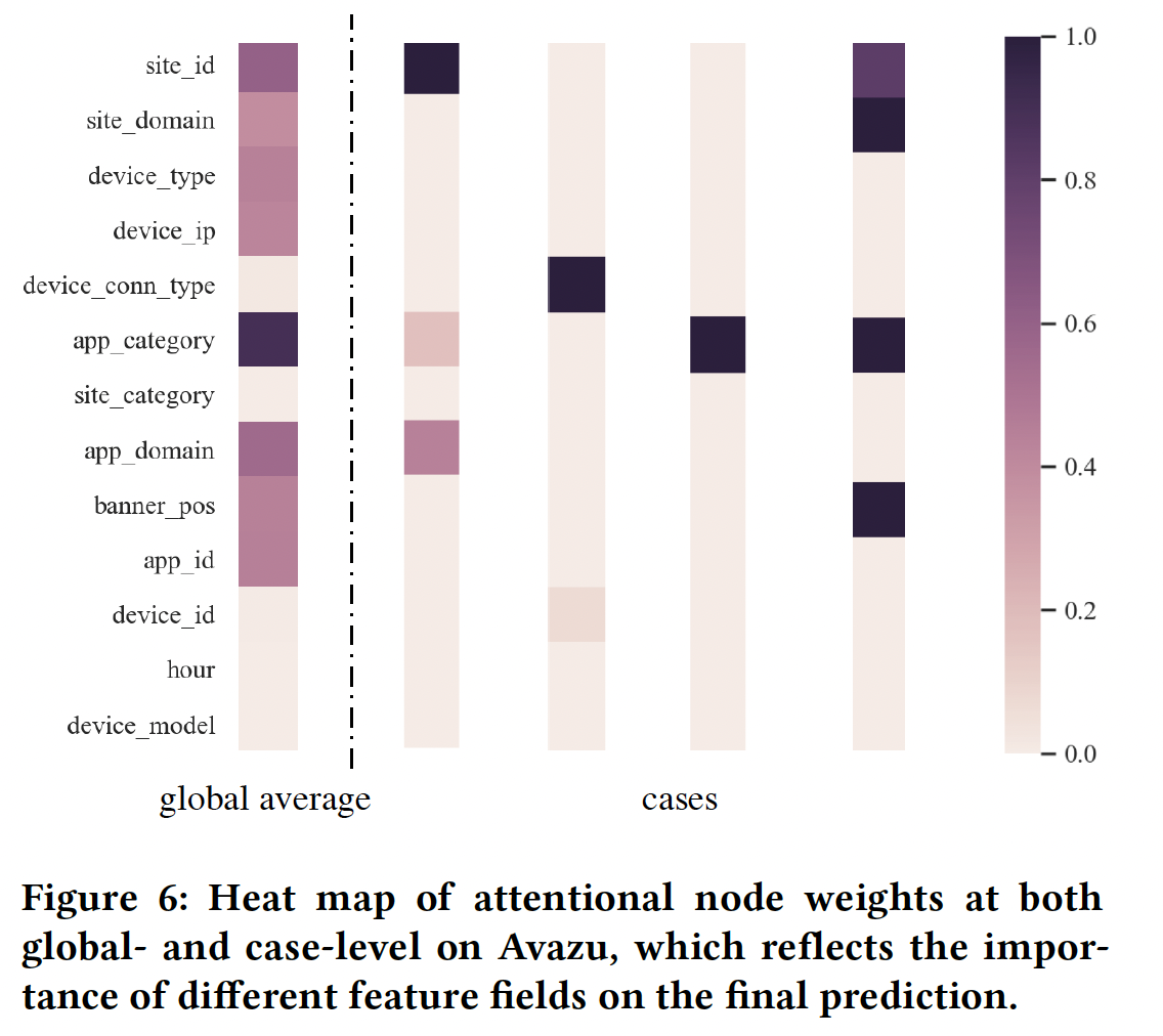 attentional node weight :attentional node weight 反映了 feature field 对整体预测分数的影响的重要性。下图显示了 global-level 和 case-level 的 attentional node weight 的热力图。左边的是 Avazu 数据集中所有样本的全局平均值,右边的是Avazu 数据集中随机选择的四个样本(预测分数分别为 [0.97, 0.12, 0.91, 0.99],标签分别为 [1, 0, 1, 1] )。