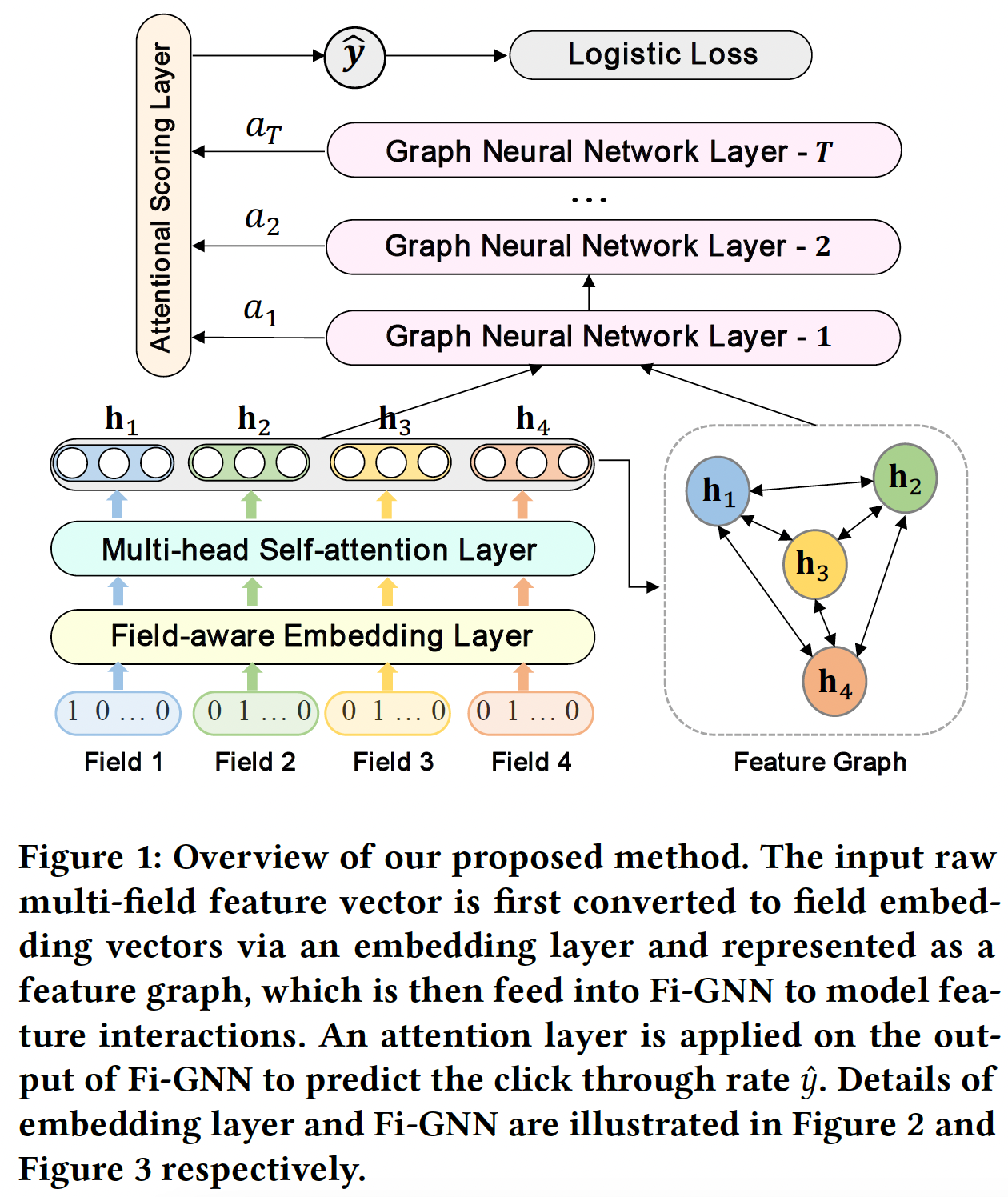 论文设计了一个新的模型 Feature interaction Graph Neural Network: Fi-GNN ,从而以更灵活的、显式的方式建模 graph-structured feature 上 feature field 之间的复杂交互。