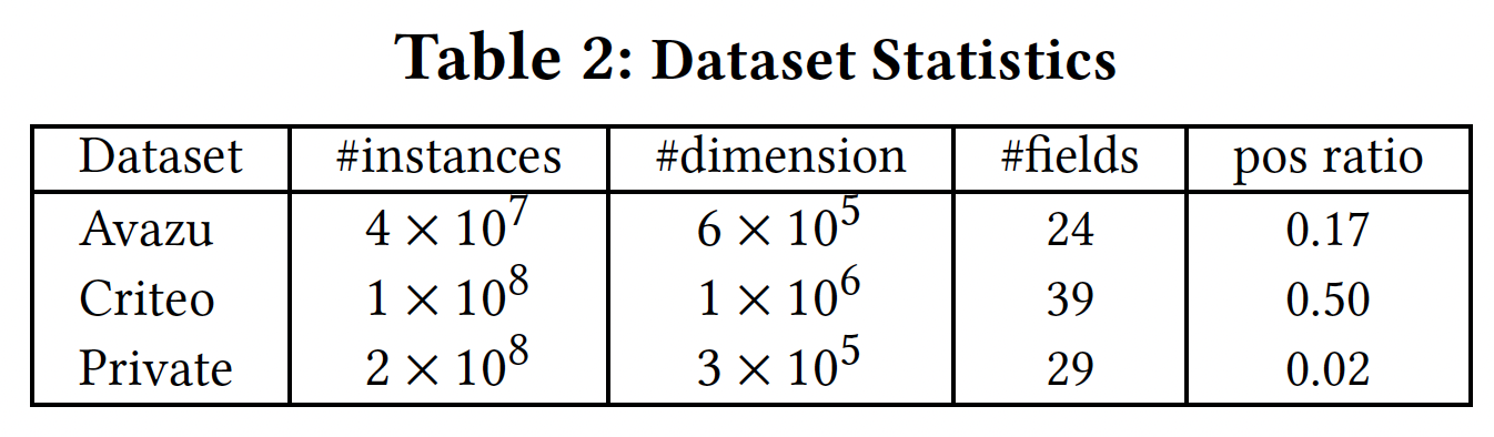 数据集:两个 public 数据集(Avazu, Criteo )、一个 private 数据集。