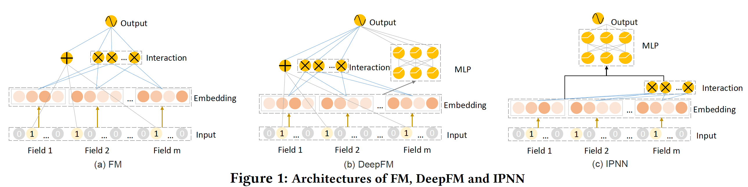 因子分解模型是指:通过内积或神经网络等操作将来自不同特征的几个 embedding 的交互建模为一个实数。我们将 FM 、DeepFM和 IPNN 作为实例来描述我们的算法,并探索在各种数据集上的性能。下图展示了 FM 、DeepFM和 IPNN 模型的结构。