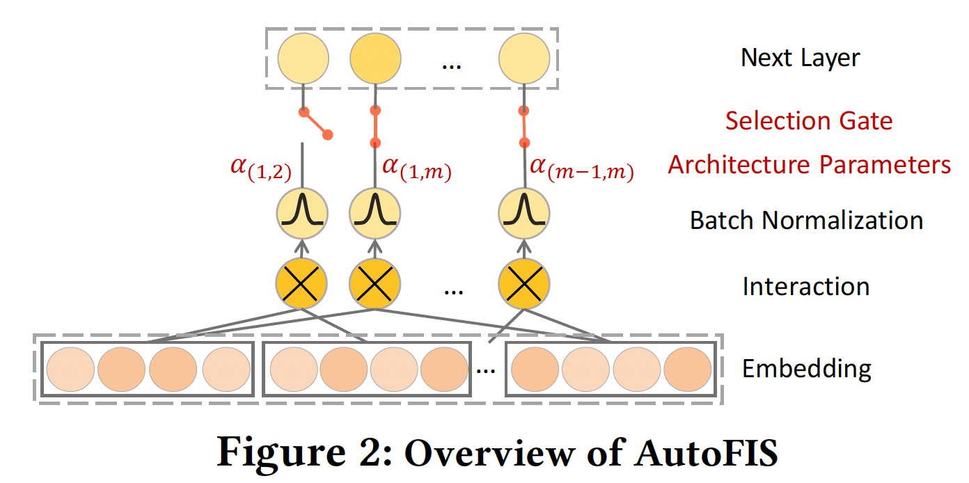 受最近用于神经架构搜索的 DARTS 的启发,论文 《AutoFIS: Automatic Feature Interaction Selection in Factorization Models for Click-Through Rate Prediction》 提出了一个两阶段的方法 AutoFIS ,用于自动选择因子分解模型中的低阶特征交互和高阶特征交互: