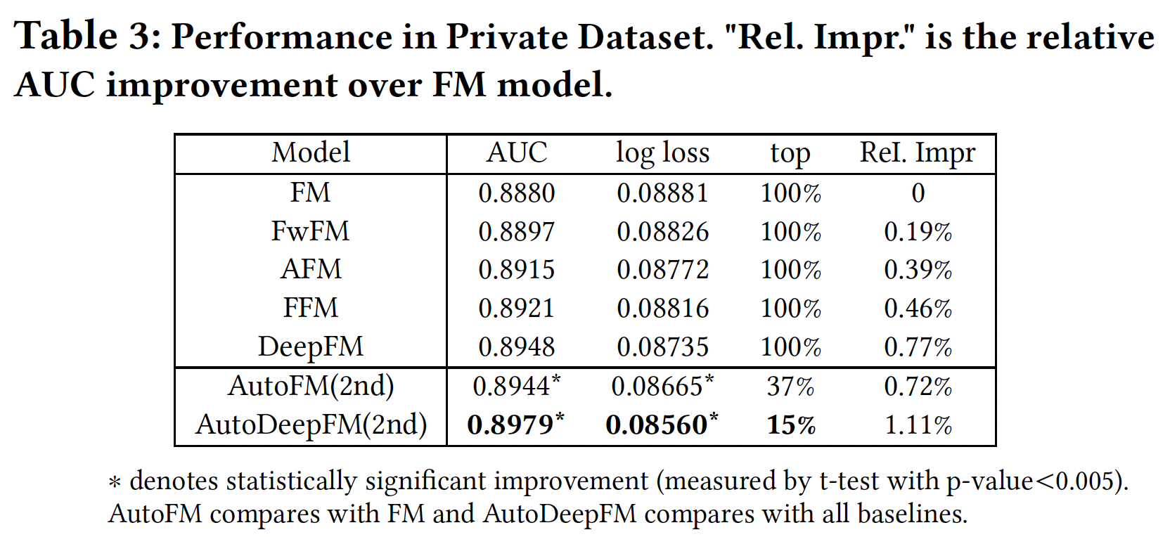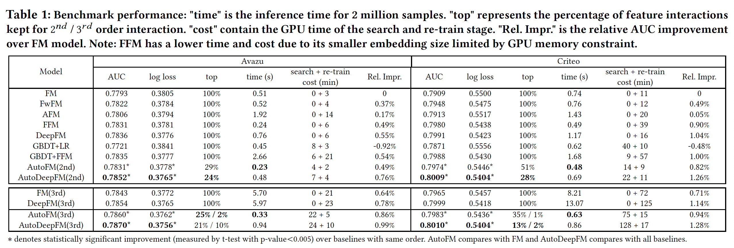 而且可以明显提高预测准确性:从 AUC 来看,AutoFM(2nd) 比 FM 的相对性能提高了 0.49% 、AutoDeepFM(2nd) 比 DeepFM 的相对性能提高了 0.20%。