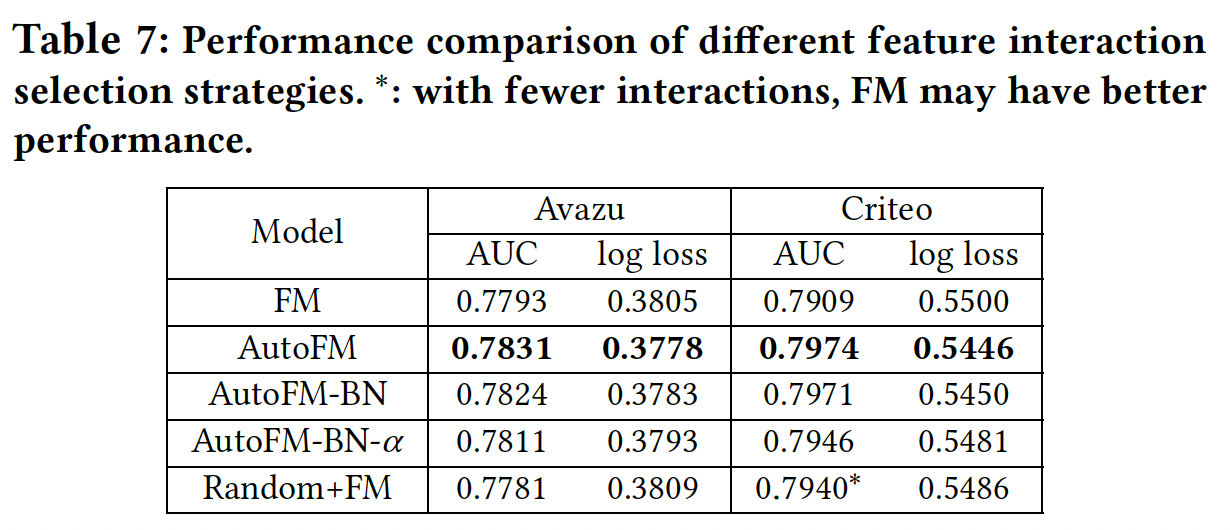 Table 7 列出了这些变体的性能。对于 "Random" 策略,我们选择与 AutoFM 相同的交互数量,我们尝试了 10 种不同的 "Random" 策略,并对结果进行了平均。