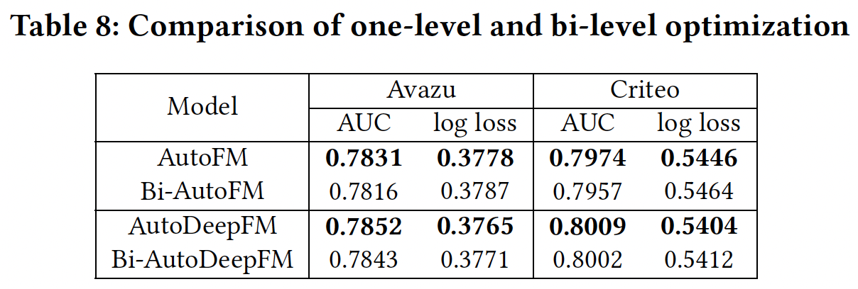 one-level optimization vs bi-level optimization:结果如 Table 8 所示。可以看到:AutoFM 和 Bi-AutoFM (以及AutoDeepFM 和 Bi-AutoDeepFM )之间的性能差距表明了 one-level optimization 比 bi-level optimization 的优越性,其原因在 one-level optimization 章节已经说明。