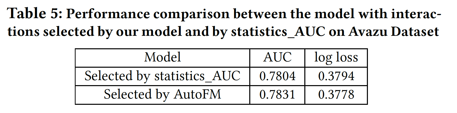 在 Criteo 数据集中,Random+FM 和 FM 之间的性能差距表明:在某些情况下,随机选择的特征交互可能优于保留所有特征交互的模型。这支持了我们的说法:移除一些无用的特征交互可以提高性能。
