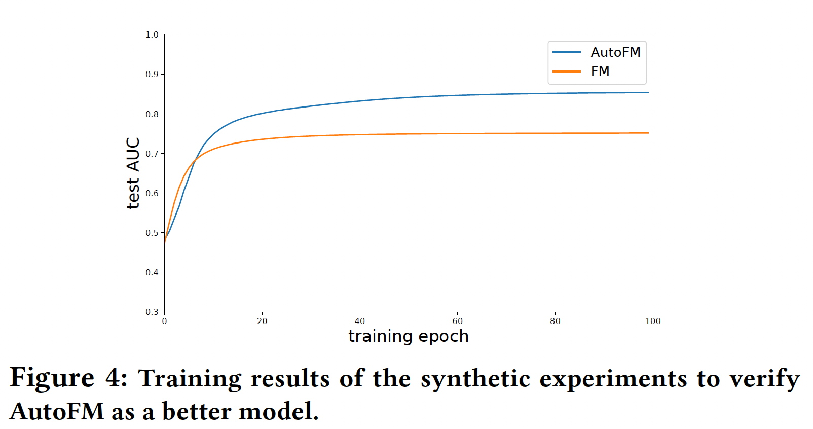 我们使用 FM 和我们的模型来拟合人工合成数据。我们在测试数据集上使用 AUC 来评估这些模型。